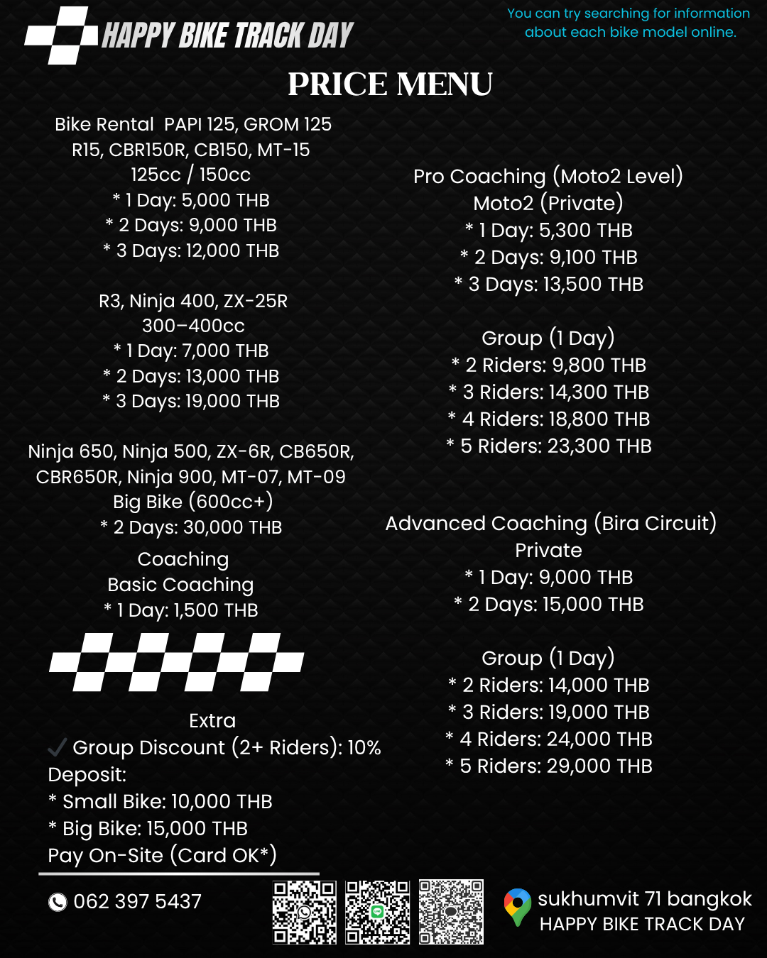 1. Beginner Intermediate Rental Bike: PAPIO125, GRO 125 Price: One-day rental fee (5000 baht) Two-day rental fee (9000 baht) Three-day rental fee (12.000 baht) 10% discount on rental fees when used in groups of two or more people